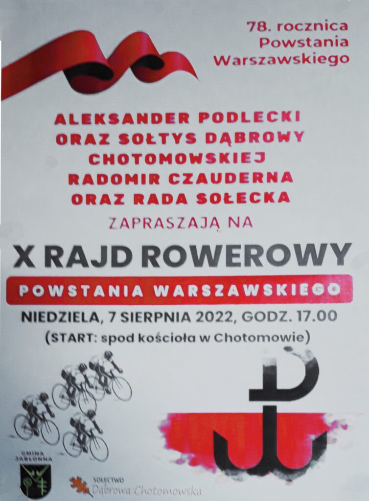 X – jubileuszowy rajd rowerowy „Powstania Warszawskiego” organizowany przez sołectwo Dąbrowy Chotomowskiej. Ze strony ZOPAK „Brzozów” z zaproszenia skorzystał Wojciech Jeute. Tak to zrelacjonował: Jestem pod wrażeniem świetnej organizacji rajdu – to główna zasługa sołtysa Radomira Czauderny, i wspaniałych prelekcji historycznych przygotowanych przez pana Aleksandra Podleckiego. Udział w rajdzie był dla mnie pięknym, patriotycznym przeżyciem. Moje gratulacje !